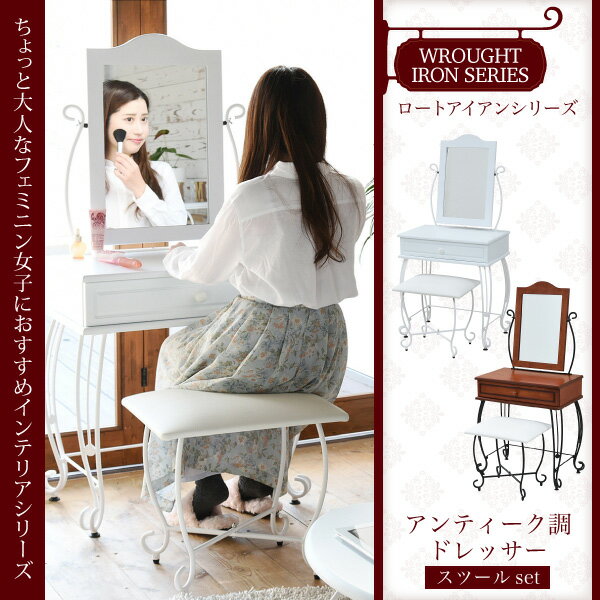 【ポイントUp6.5倍】ヨーロッパ風 ロートアイアン 家具 ドレッサー スツール 付 ミラー角度調整可 アイアン 脚 アンティーク風 メイク メイク台 鏡台 化粧台【代引不可】[18]
