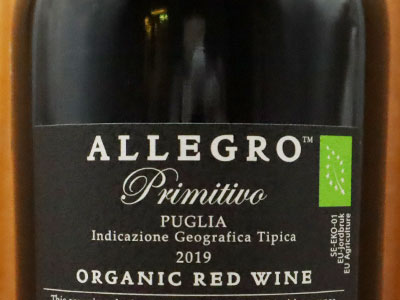 【6本お買い上げで送料無料】アレグロ プリミティーヴォ 2019年 数量限定輸入品 フレンチオーク樽100%熟成 マーレ マンニュム社 自然派オーガニック(EU認定)ワイン 14.5% 正規品(スクリューキャップ)ALLEGRO Primitivo 2019 Organic Red Wine IGT Puglia Primitivo