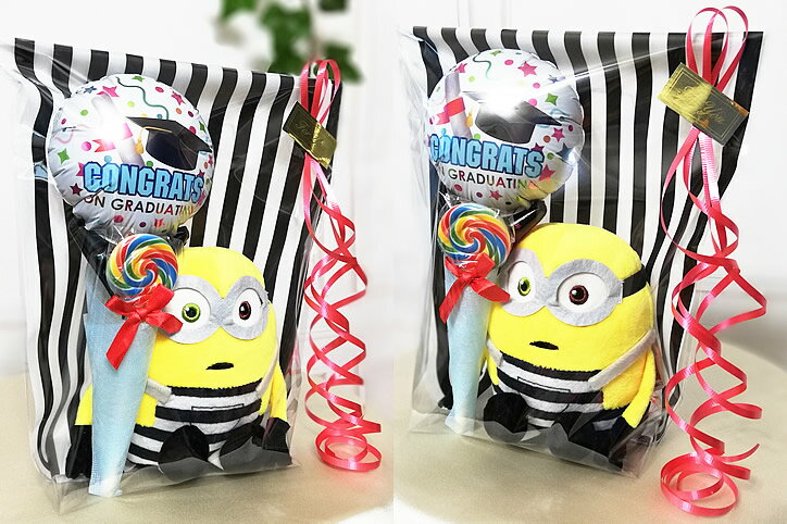 ボブ ケビン スチュアート 入学 卒業 お祝い バルーン電報 誕生日 プレゼント ぬいぐるみ ミニオンズボーダー&選べるミニバルーン&キャンディペン3点ギフトS