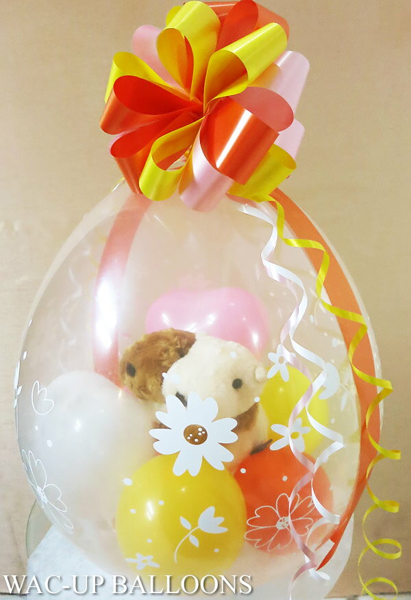 花柄バルーンの中に、暖色系のミニバルーンと くりくりな瞳とほわ〜んとした顔がおちゃめな 最強の癒し系動物のカピバラのペアぬいぐるみを入れて、 トップの大きなリボンで華やかさを添えました。